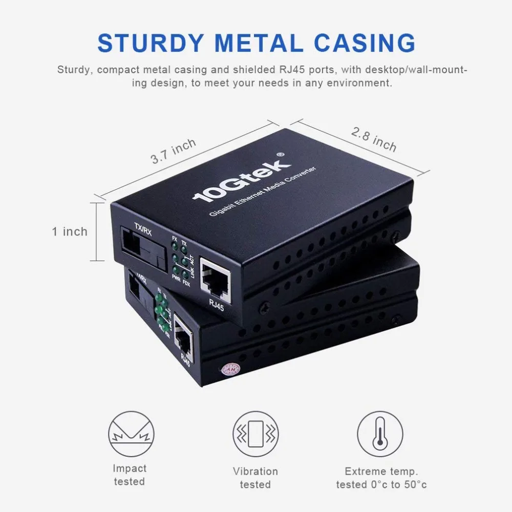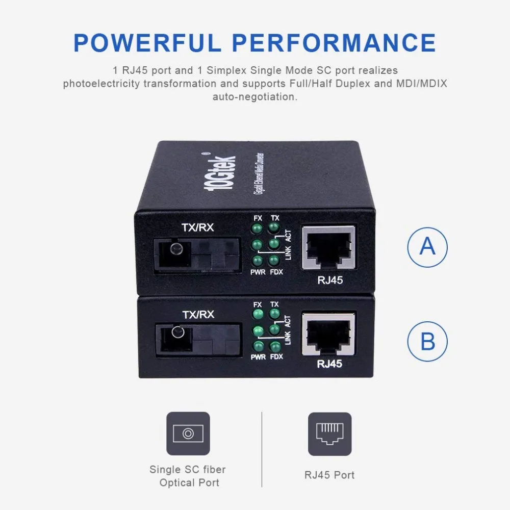 10Gtek A pair of Gigabit Fiber Media Converters, 10/100/1000Base-Tx to 1000Base-LX Bi-Directional Single-mode SC fiber, 20KM