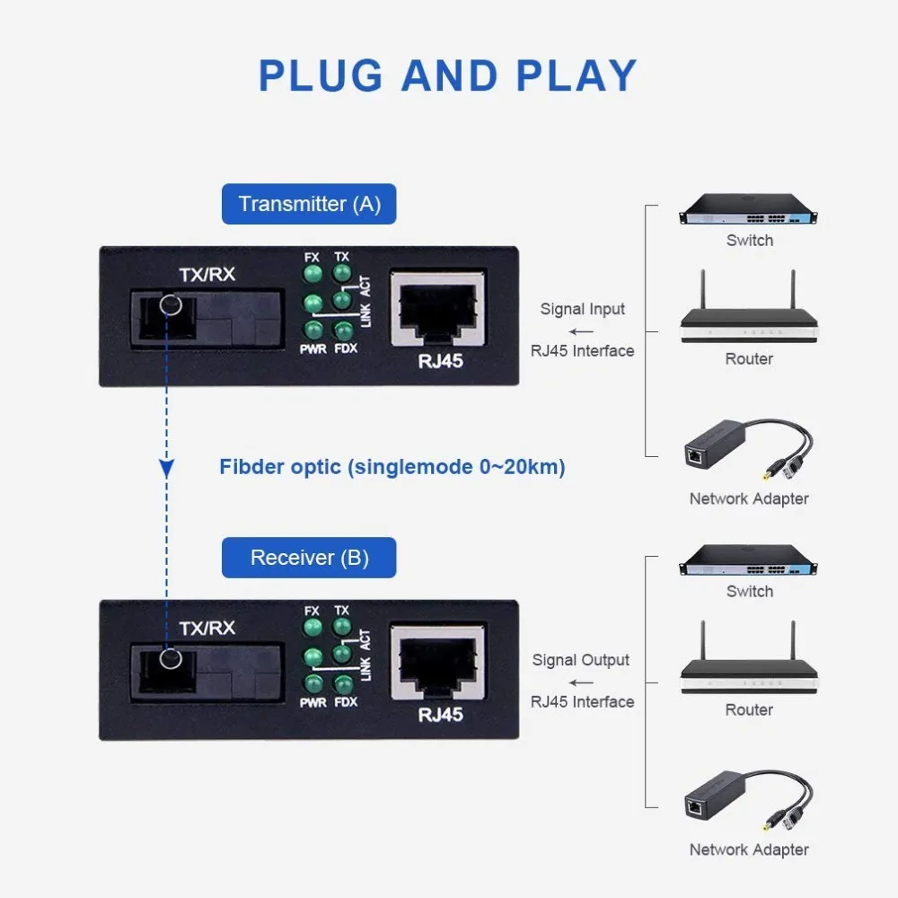 Aliexpress has 10Gtek A pair of Gigabit Fiber Media Converters, 10/100/1000Base-Tx to 1000Base-LX Bi-Directional Single-mode SC fiber, 20KM for just $ shipped.